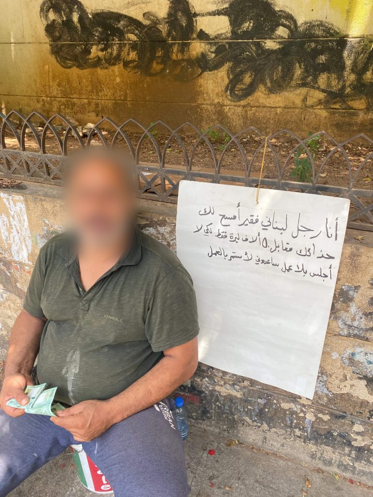 A man holding a poster that translates to ‘I am a poor Lebanese man willing to polish your shoes for 50,000 Lebanese Pounds (0.5 USD) so I do not become jobless. Help me keep working’. Credit: Mohamad El Kari